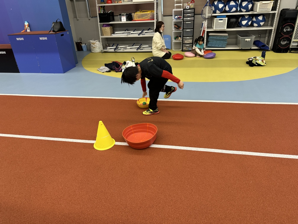 片足でケンケンをすることで、バランスを取る能力を養い、 片足で地面を蹴って進むため、脚の筋肉を鍛えることができます。 ケンケンをしながら、腕や体の他の部分を連動させることで、全身の協調性を高めます。 また、チームでリレー形式でケンケンを行うことで、協力して課題を達成する喜びを体験します。