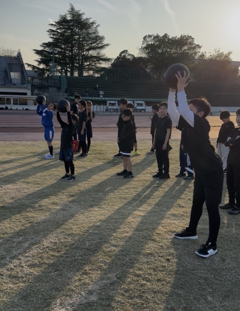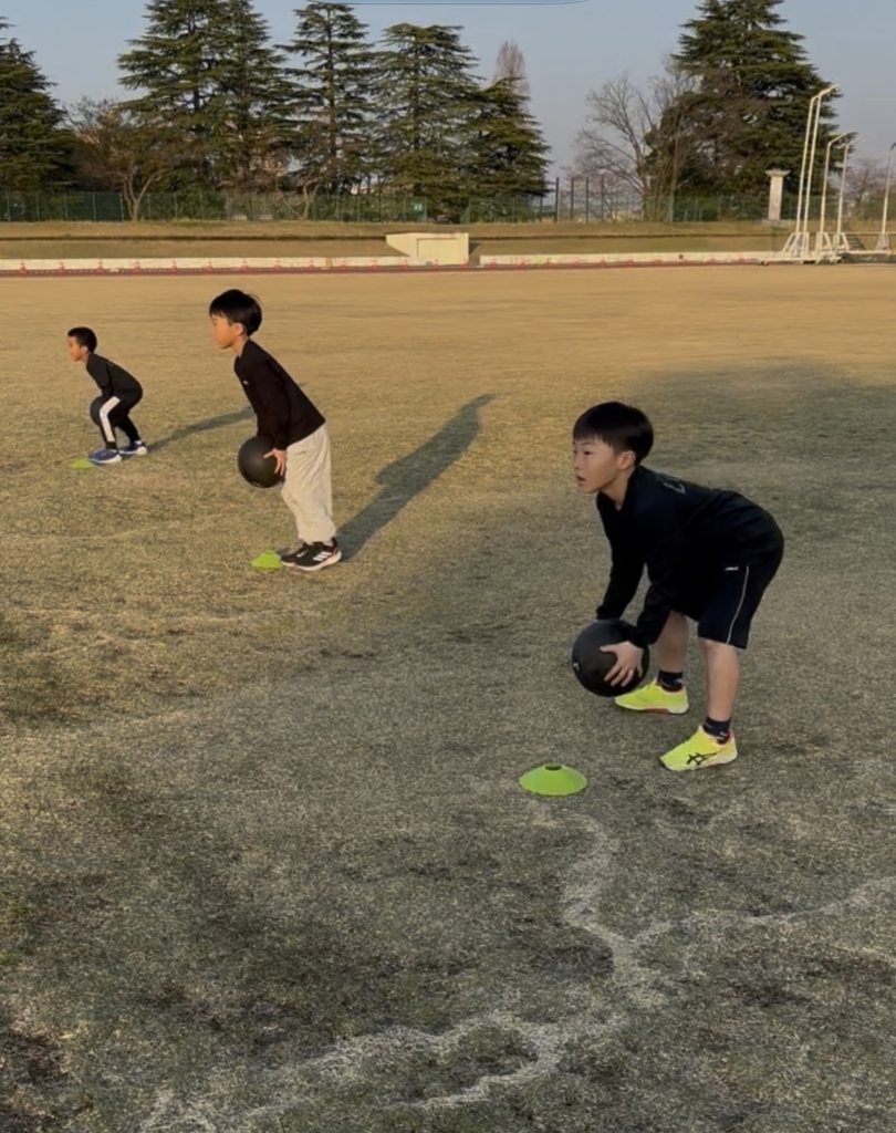 休憩後、1kgのメディシンボールを使ってパワートレーニングを行いました。腕だけ、腕と脚、保持走、スローイング、脚トスなど全身を動かしました。