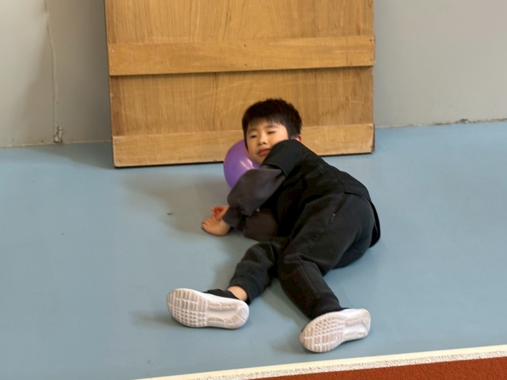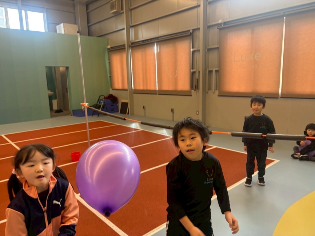 風船運動では、風船を跳ね返したり蹴ったりしながら、地面に落とさないようゲーム感覚でトレーニングを実施。