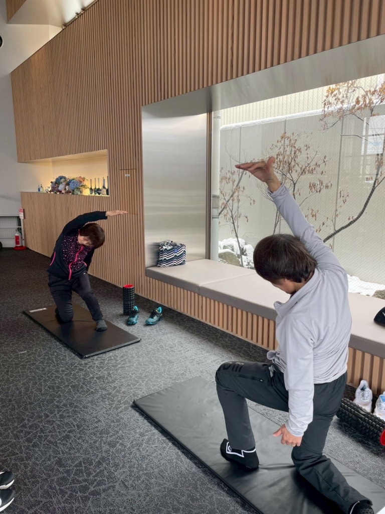 まずは、普段通りのストレッチで体をほぐした後、股関節と肩甲骨周りのストレッチをしっかり行い、体の柔軟性を高めました。