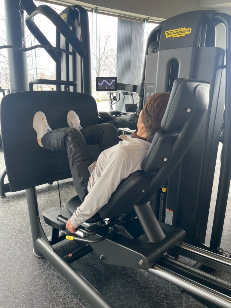 その後は、マシーンを使った下半身の筋力トレーニングを行い、スキルミルで5分間歩行を実施。