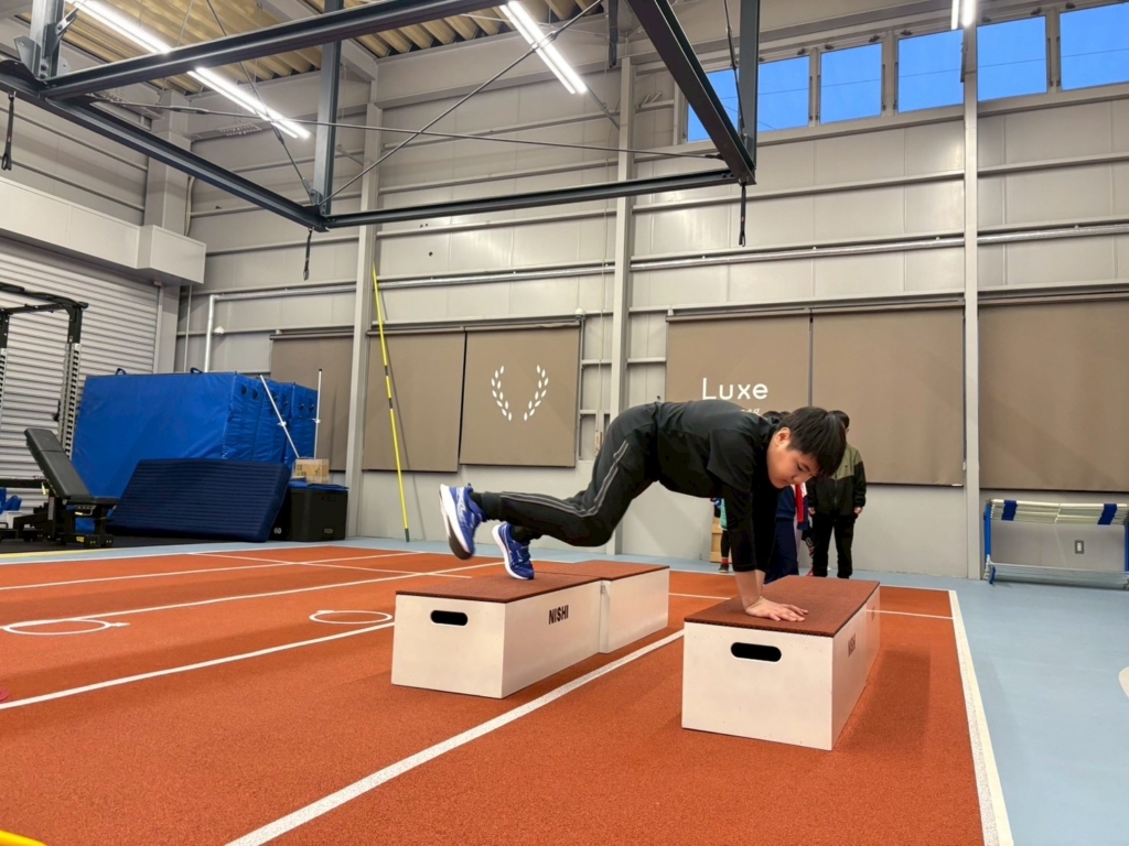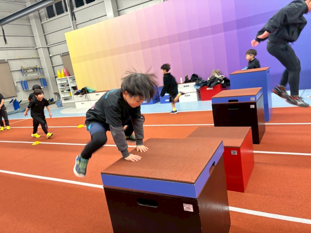 続いて、リレー、ボックスジャンプ、ハードル走、ドッジボールを行い、瞬発力や体のキレを意識して体を動かしました。