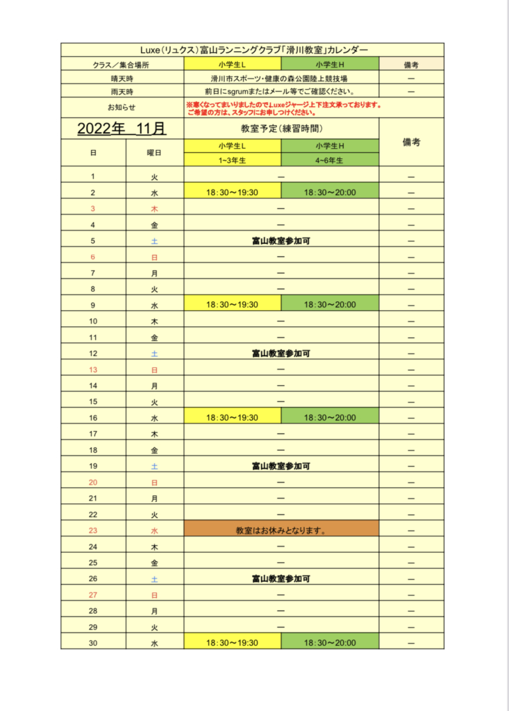 11月富山・滑川・五福教室スケジュール 2022 10/19 お知らせ練習スケジュール 2022.10.19 (富山教室) (滑川教室) (五福教室) 教室が始まる時間と終わる時間で温度差が激しくなってきました🍁🍂 教室に参加される前は、暖かい服装でお越しください✨ お知らせ練習スケジュール この記事が気に入ったら いいねしてね!