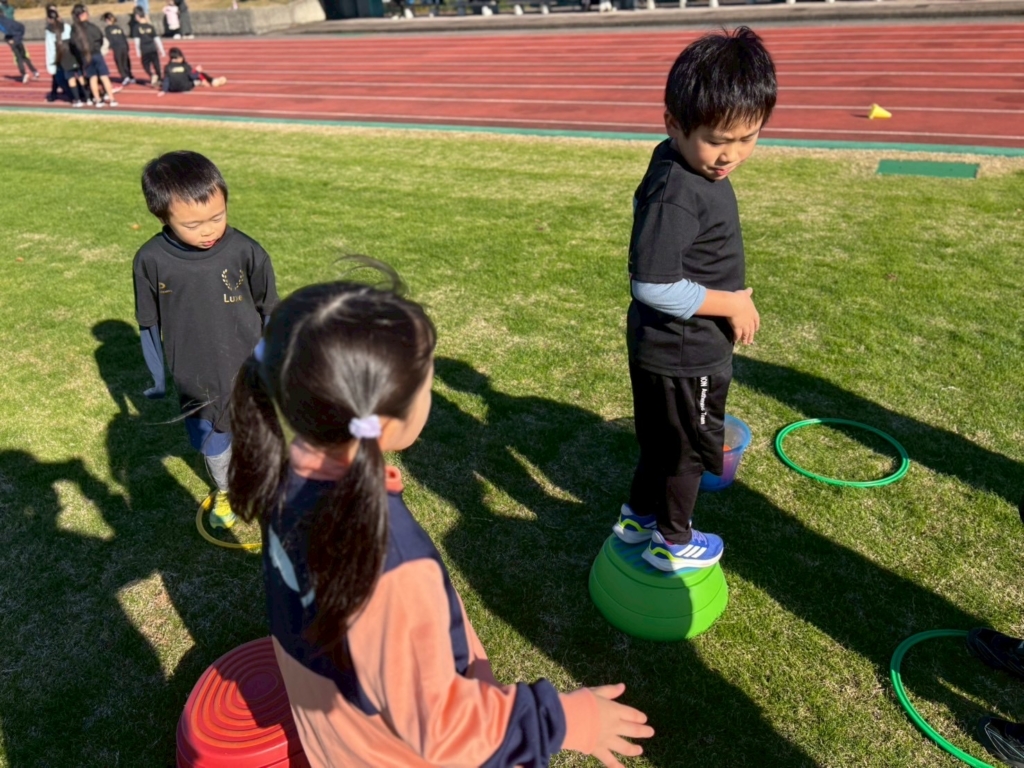 • コーンジャンプゲーム:片足にコーンを入れて、落とさないようにジャンプ!バランスと集中力が試されるゲームでした。