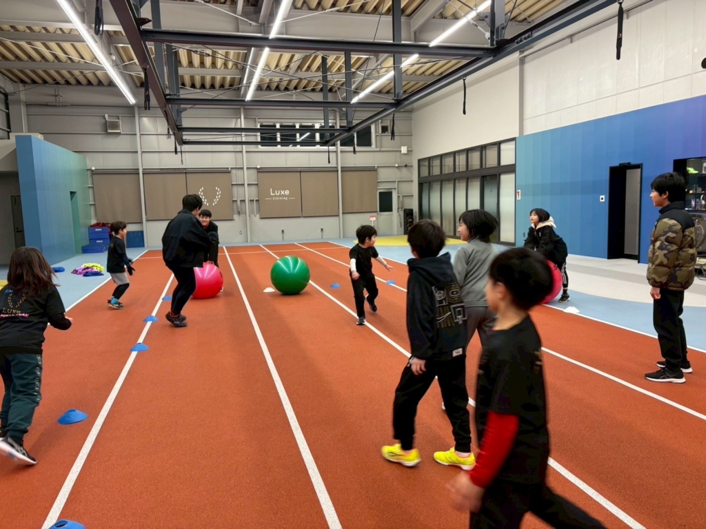 お互いに声を掛け合いながら、バランス感覚や体幹を鍛えるトレーニングを行い、楽しみながら集中して取り組む姿が印象的でした。