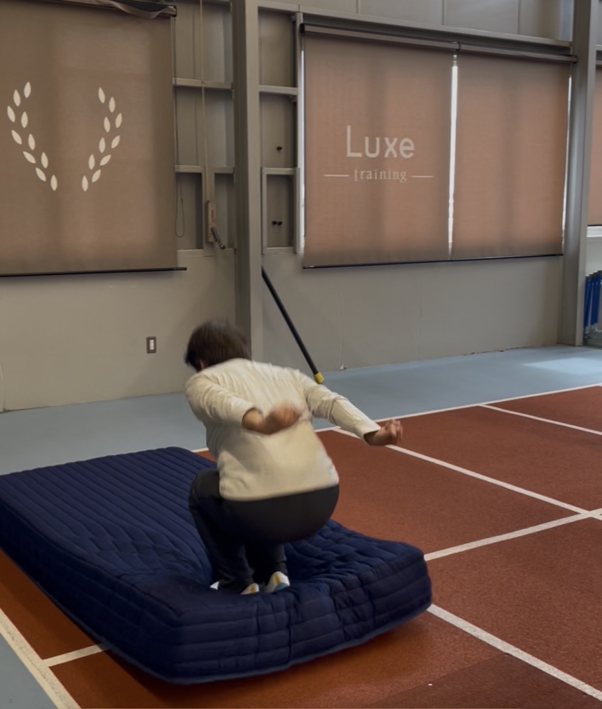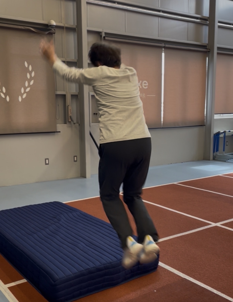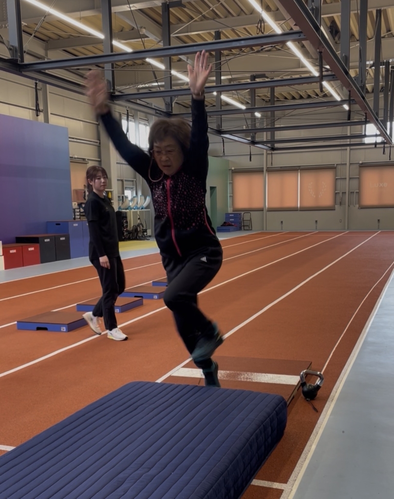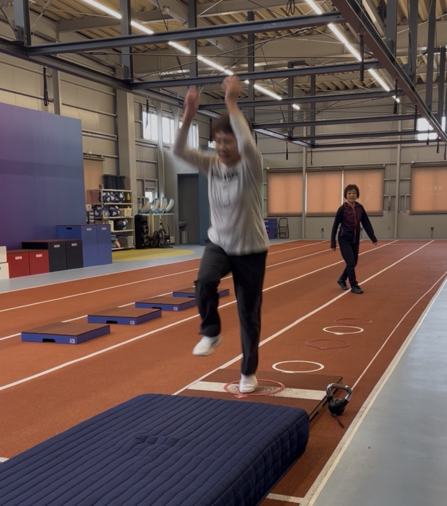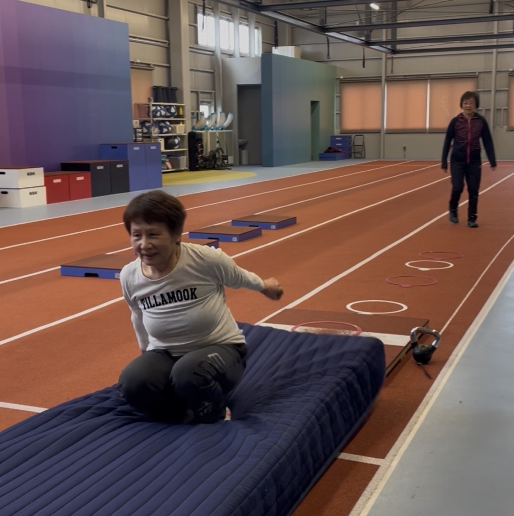 富山県マスターズ陸上60m W70とW75記録保持者の会員さんから要望があり走幅跳を指導する事になりました。お二方も経験した事がなく、まったくの「ど素人」です。まずは、踏切のメカニズムから説明し、どのように着地まで持っていくのかを実践しました。