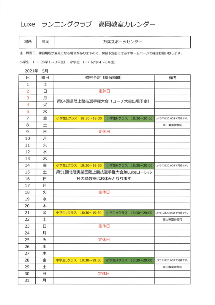 5月高岡教室練習スケジュール 2021 4/28 お知らせ練習スケジュール 2021.04.28 5月に入り、いよいよ大会が始まります! 自己記録を目指して一緒に頑張っていきましょう! お知らせ練習スケジュール この記事が気に入ったら いいねしてね!