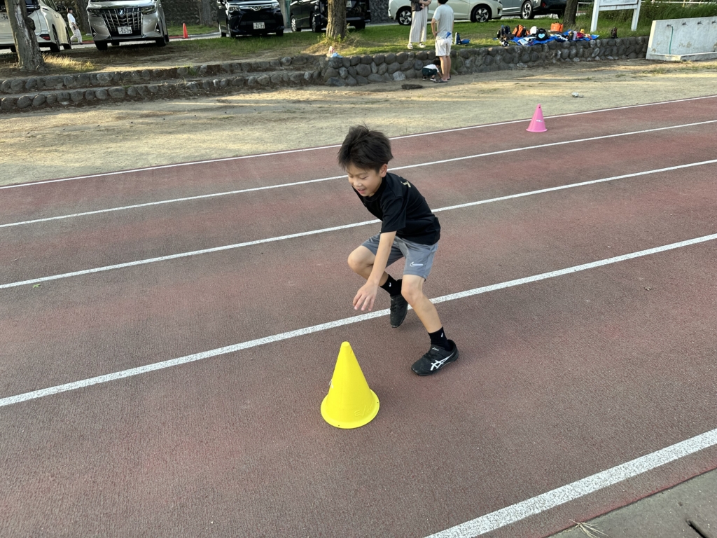 今日のウォーミングアップはコーンを利用した変化走を中心に力の強弱やエネルギー転換を学習しました。短距離(かけっこ)走または長距離走しか指導しないクラブには必要のない動きづくりですが、Luxeランニングクラブでは他の種目や他のスポーツには不可欠な「ストップ&ゴー」を重視しています。