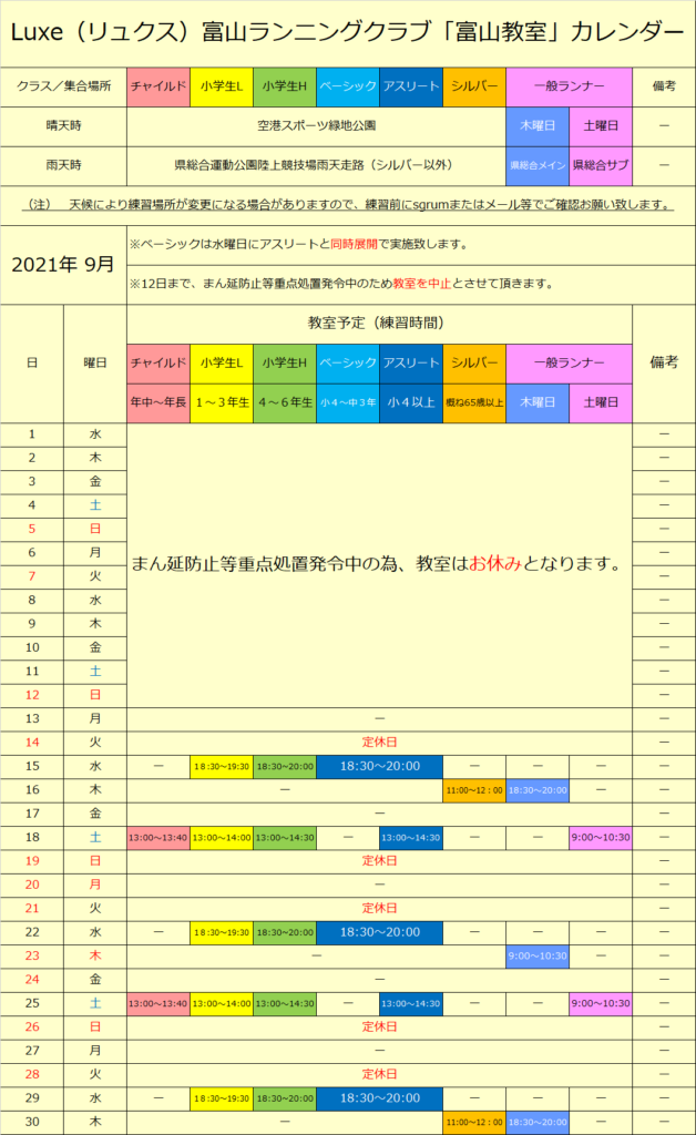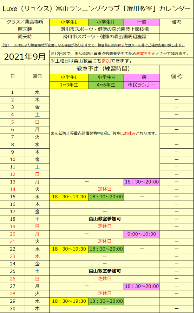 9月富山・滑川教室練習スケジュール 2021 8/25 お知らせ練習スケジュール 2021.08.25 9月は教室の回数が少なくなってしまいましたが、感染症対策をしっかりと行い、元気に活動しましょう(^^)/ 皆様にお会いできることを楽しみにしております♪ 富山教室スケジュール 滑川教室スケジュール お知らせ練習スケジュール この記事が気に入ったら いいねしてね!